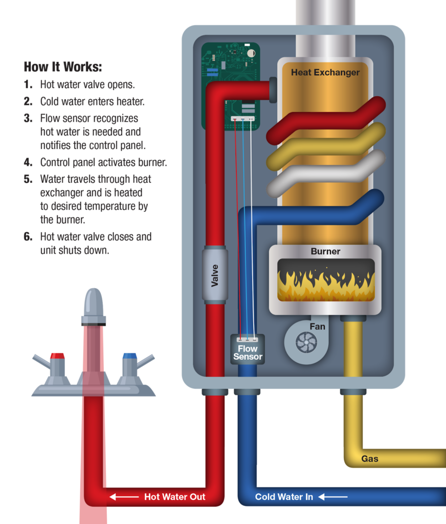 Unlike a traditional water heater that stores 40 or 50 gallons of hot water in a tank and keeps it heated all day, a tankless unit heats water on demand. When you turn on a hot water faucet, cold water flows through the unit, passes through a heat exchanger, and comes out hot on the other side. When you turn the faucet off, the heater stops firing.